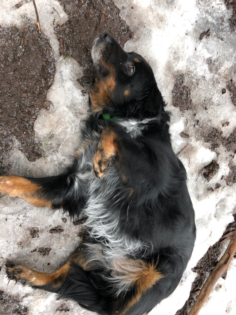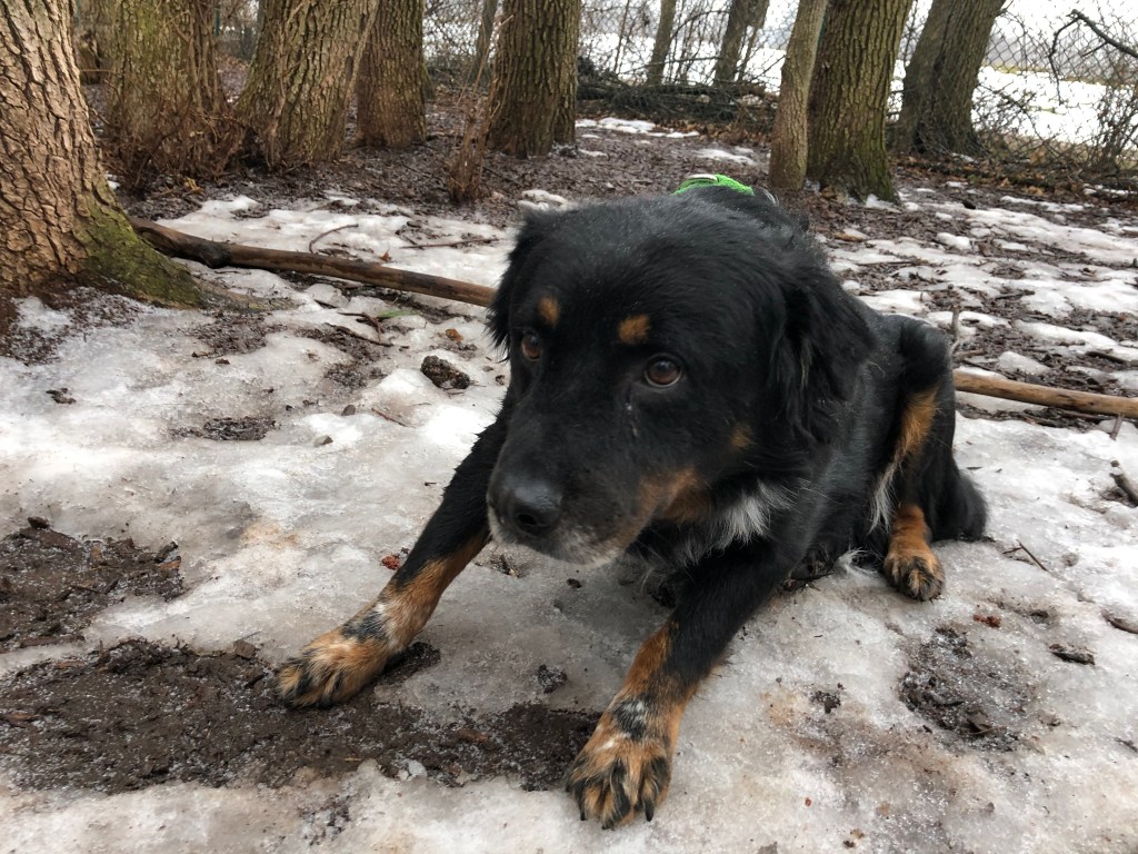 At the dog park, we hoped you’d feel more at home. You wouldn’t have to be on the leash that was so foreign to you. We brought you in the park, shut the gate behind us, and unclipped your leash. You promptly rolled over onto your back, exposing your salt and pepper belly. Rosie ran off to explore. I spotted a tennis ball. Rosie’s never been interested in balls or sticks, but I hoped you might be. I threw the ball and yelled, “Go get it, Rocky!” You did not go; you did not get it. With no incoming belly rub, you flipped over onto your front, as if to say, I guess this is my home now.