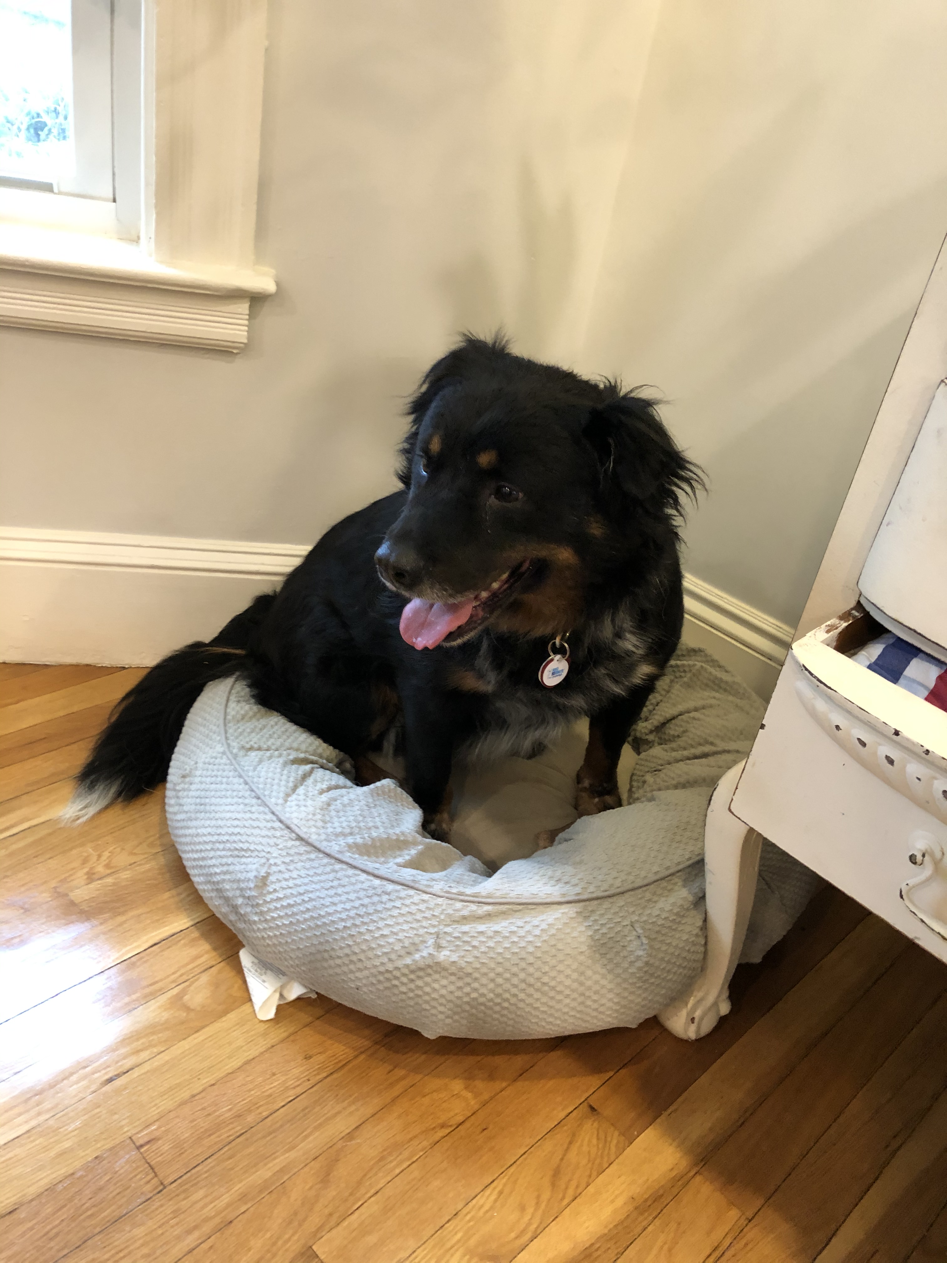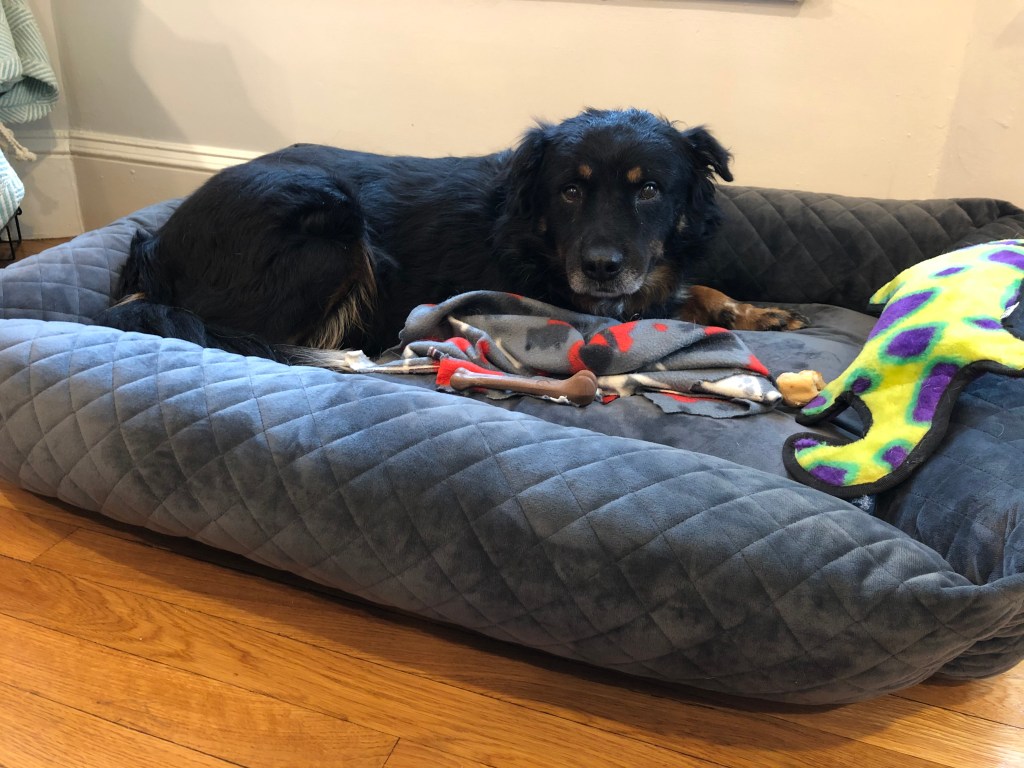 We drove you to your actual new home, where you immediately flopped into the bed we’d bought you, a bolstered one, just like your foster mom said you’d like. Like a very big, dark Goldilocks, you also tested out Rosie’s bed several times. I tried very hard not to laugh at you, because we’re trying to make you feel at home.