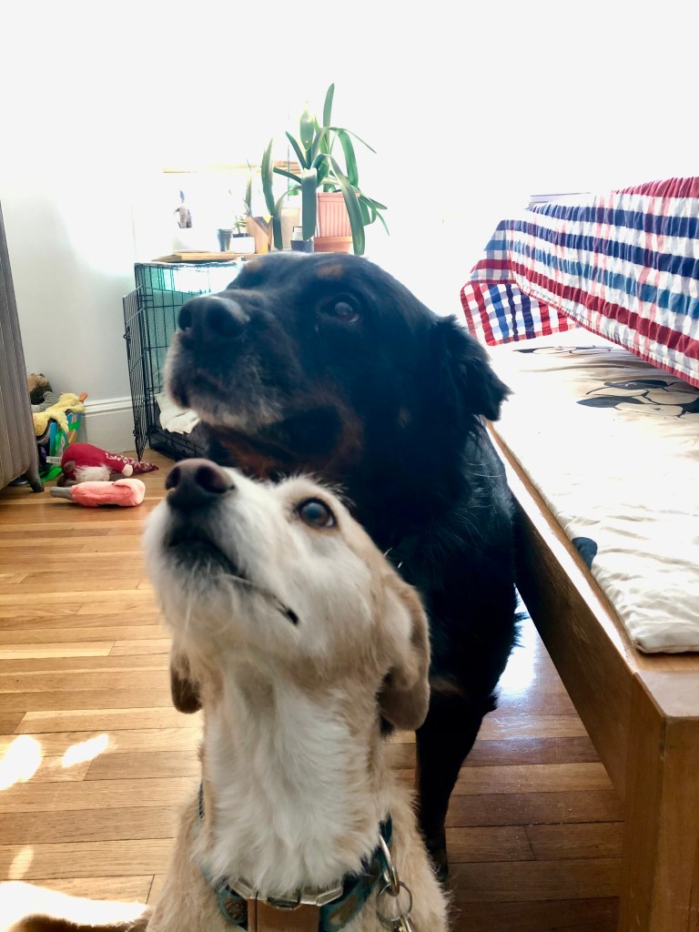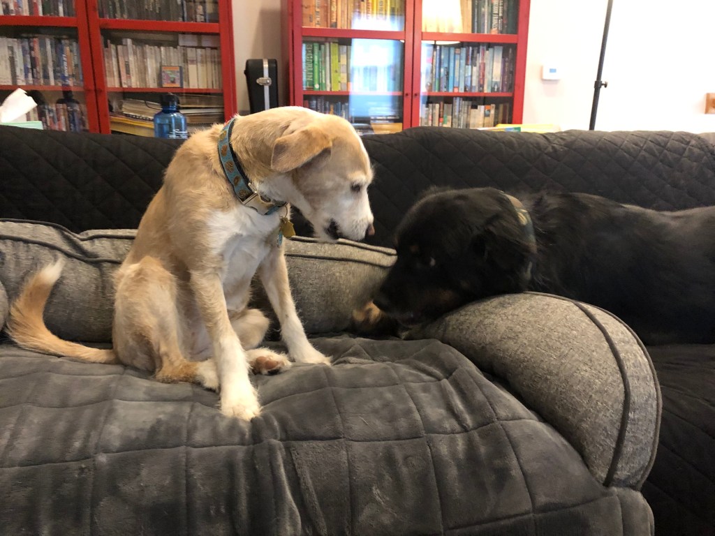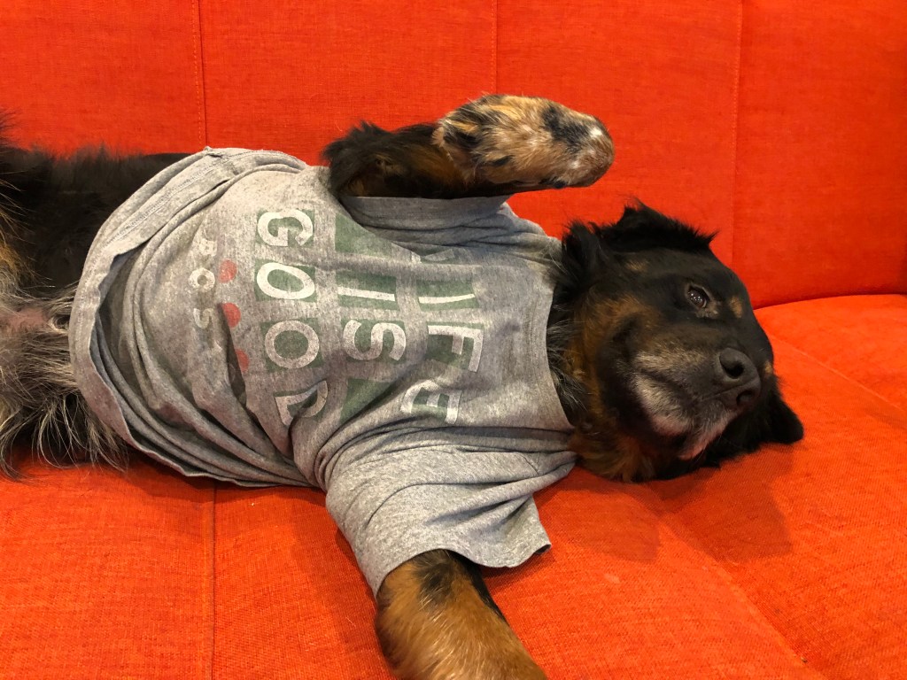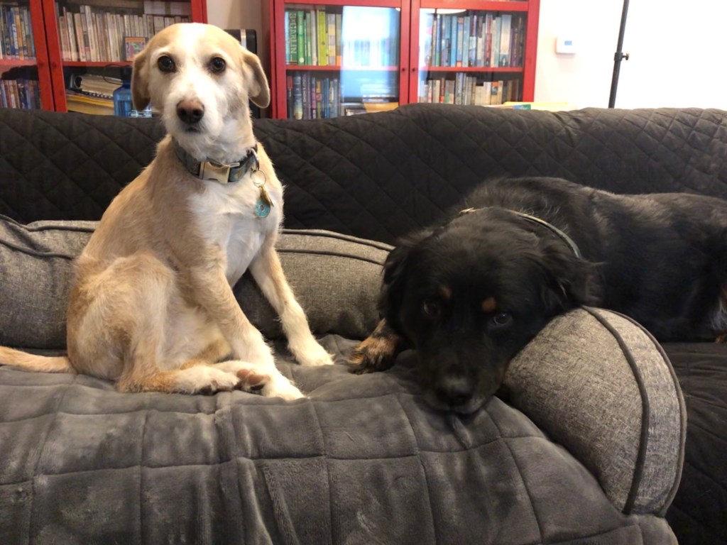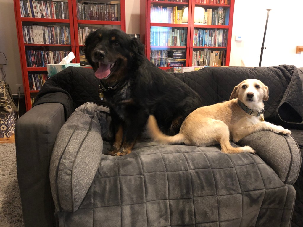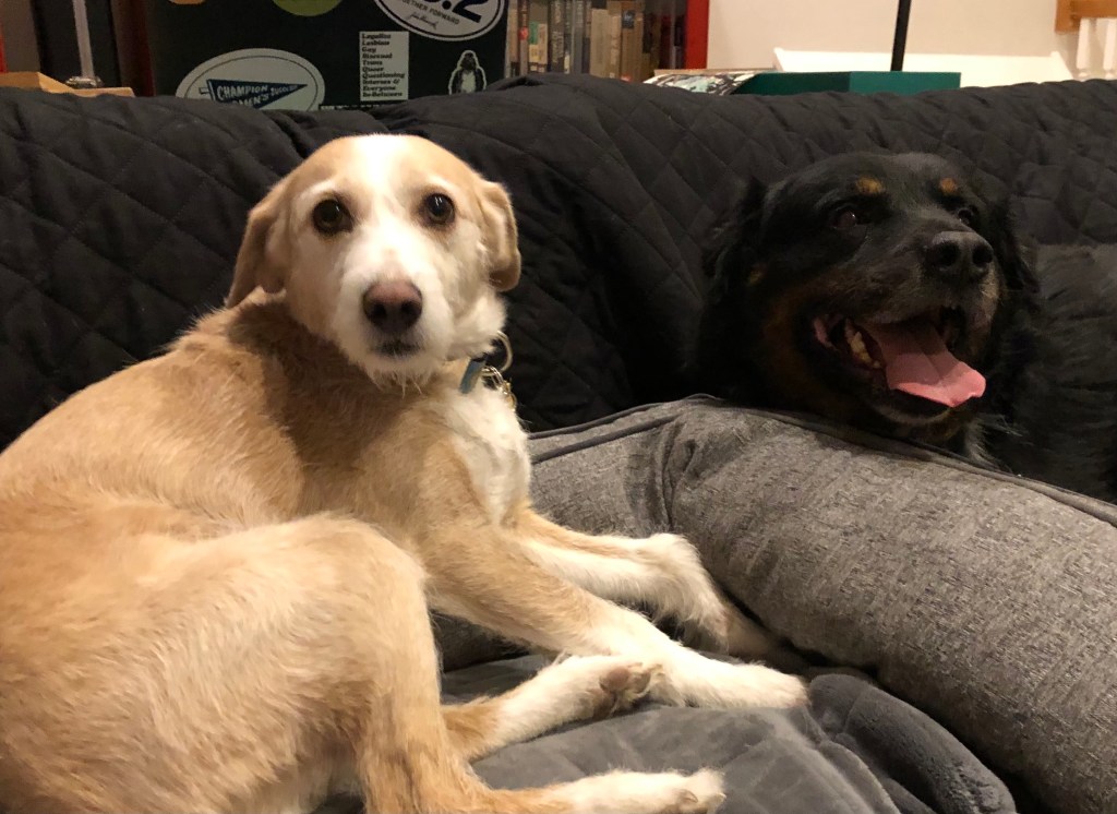 I love you, buddy. Let’s get that out of the way. I know you’re a little frightened right now and unsure what to make of us. Matty is big and loud and male and refuses to use the universally accepted high-pitched dog-parent voice to talk to you. Hazy keeps shoving a laptop in your face so you can be on her Zoom calls. George insists on hugging you, refusing to entertain the idea that most dogs don’t like hugs and despite our frequent reminders that you’re new and scared and need your space. And Rosie, well, she may only be a third your size, but she growls at you when you get in the car, sit too close to her on the couch, or try to eat your own food. It’s a lot, I know.