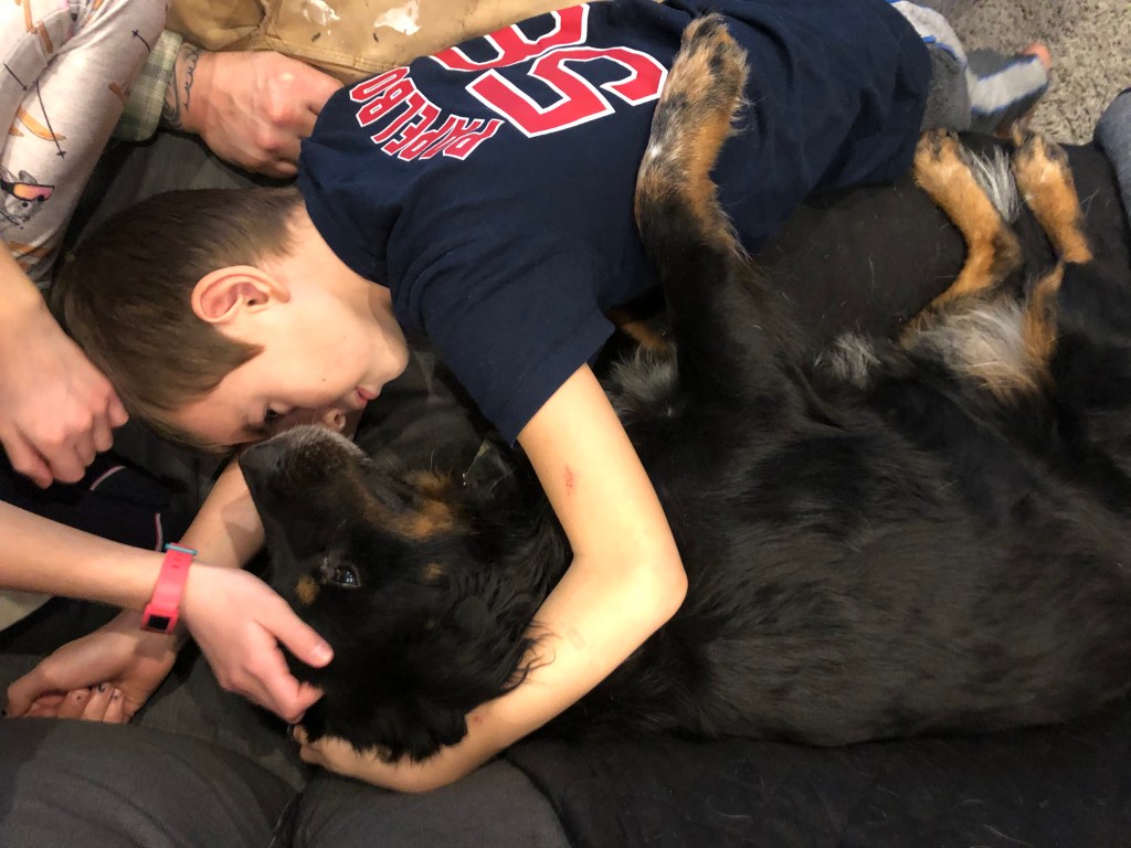 Gradually, over the week, you came out of your shell. You ate all of your dinner Sunday night, severely disappointing Rosie. You started approaching us with a wagging tail, first the kids, then me, then Matty. You came and sat on the couch with us when we watched TV. First you sat on the couch cover we’d put on just for you, then you tried to sit with Rosie (growl), then you proceeded to drool and shed your black fluff all over the couch and every single cushion on it.