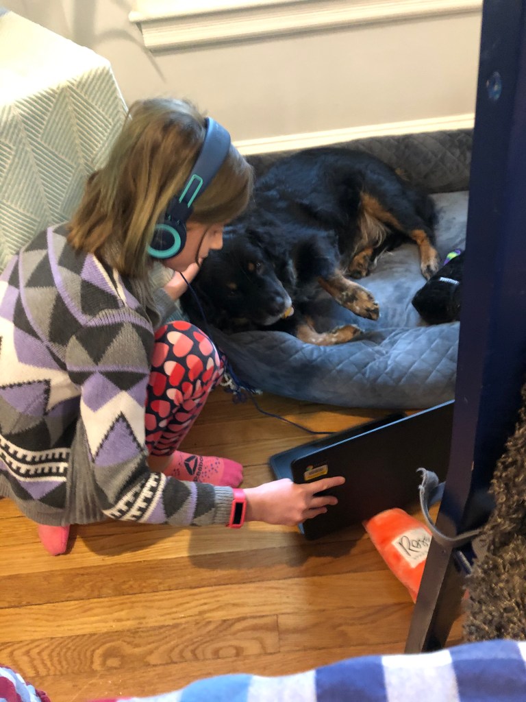 You come running over anytime any of us starts talking dog-talk to Rosie. We have to use one hand to pat each of you at the same time so nobody gets jealous. You’ve gotten bold about demanding your belly rubs and pats, nudging us with your big noggin if we take a break for even a second. You like to sit on the couch downstairs while Matty and the kids are at their desks.