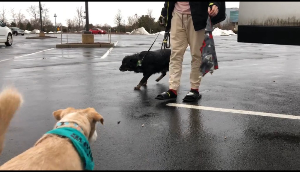 I held your nonplussed future dog-sister back while she put on a brave front and wagged her tail. Matty slowly approached and attached your new camo leash to your neon green Martingale collar. We then attempted to drag your Eeyore body to the nearby strip of grass, thinking you had about 24 hours of stored up pee to let out. Somehow, incredibly, admirably?, you continued your pee-strike. After 10 or so futile minutes, we brought you to the car, where Rosie reminded you she didn’t want a brother with a quick growl. As we drove to a nearby dog park for Pee Attempt #2, you placed your sweet face on the divider between us and I felt a glimmer of hope.
