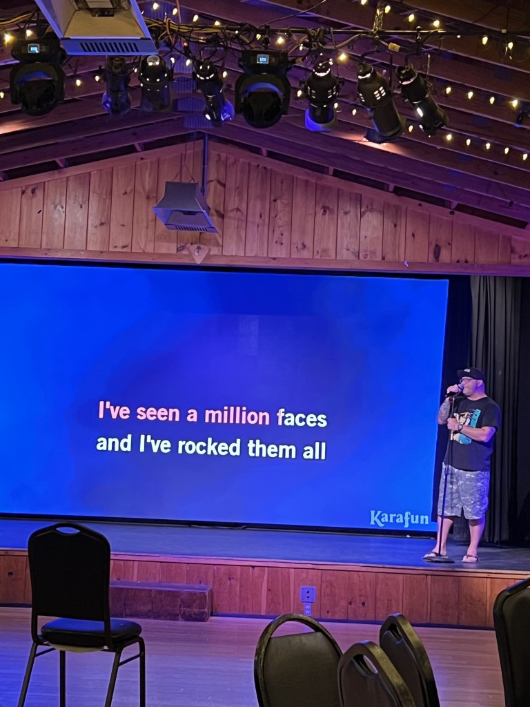 Went to 18+ karaoke night. Straddled a chair, crawled across a table toward Matty while I sang “Take On Me.” Watched Matty do his old classic, Wanted Dead or Alive. Did a duet of Total Eclipse of the Heart (Old School/Dan Band version) with Matty, dropping F bombs left and right. Got karaoke-propositioned by Suzanne and her husband, who said we were “the only cool people here,” and then made us sing a quartet of “That’s What Friends are For” with them. Pretty sure Suzanne tried to kiss me during “I Wanna Dance with Somebody” on the dance floor. We *just* became friends, Suze, I’m not quite “somebody who loves you” or frankly, even somebody feeling the (high-octave) heat with you yet.