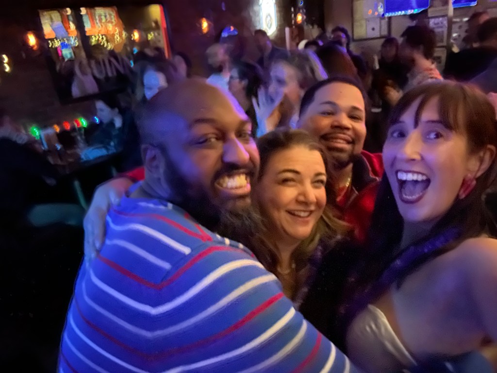 Random friendly drunk people Some people are mean drunks, some get a little harass-y, but I find that most people are super friendly drunks, especially at karaoke. I kind of love that special camaraderie that happens at a karaoke bar late night when everyone is like, “Woooohoooo!” when you pick a fun song to sing, even if you sing it horribly off-key. We went to our local dive bar the other night after Kowloon Friendsgiving™ and first we made best friends with this one guy and later this woman came up to me in the ridiculous prom dress my mother-in-law thrifted for me and said very dramatically, “You are STUNNING!”