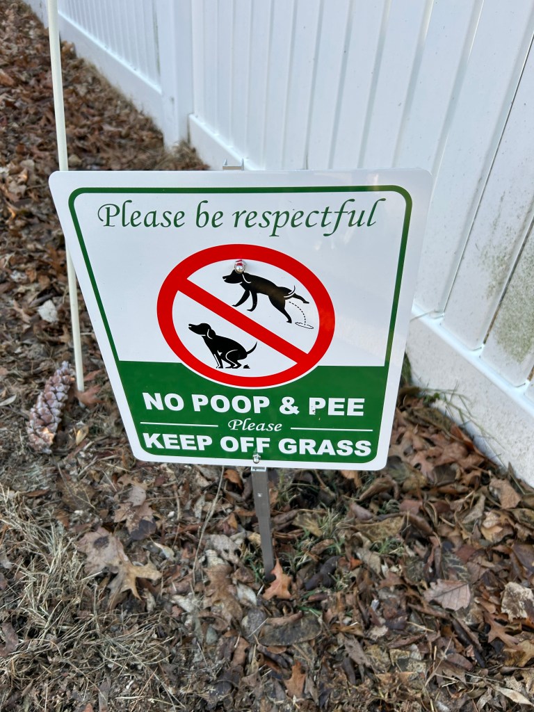 We live in the city. I walk my dogs in the park but we have to walk a few blocks to get there, including past this sign. The audacity of these people. First of all, my dogs can’t read, so they don’t understand why I hustle them past this house like it’s haunted. Secondly, as you can see in the pic, there is no grass in sight. And what’s really disrespectful is expecting my dogs to bypass your pile of dirt and leaves and hold their pee in like they’re me on a 2-hour road trip. What’s gonna happen if Rosie does her little handstand pee on your dead leaves, huh, bro?